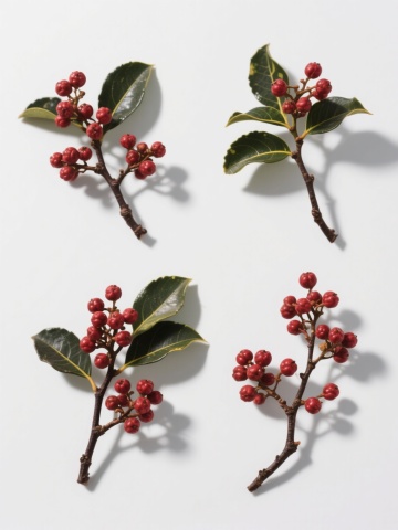 极简风格静物摄影,纯白纯色背景,4个完全不同造型的天然枯树枝摆件系列素材集合,每个树枝保留自然的纹理、结节和弯曲形态,左侧搭配新鲜的绿色细叶与未开放的花苞,整体采用对称规整的网格排布,高清晰度,柔和顶光,清晰阴影,自然材质质感,简约构图,适合作为系列设计素材使用