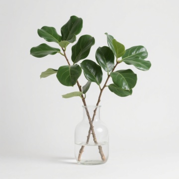 透明玻璃广口花瓶中插着几枝琴叶榕,枝干修长,叶片呈提琴形状,浓绿有光泽,瓶内装有半瓶清水,整体构图简洁优雅,白色背景突出绿植主体,光线柔和,营造出清新自然的家居装饰氛围。