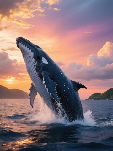 梦幻插画风,超现实主义巨鲸腾空,云浪交织,人群奔逃,场景奇幻。