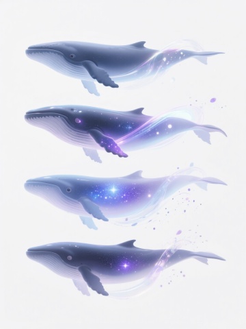 梦幻唯美的插画风格背景,深邃而璀璨的深蓝色宇宙般空间,巨大的蓝鲸身体由无数闪烁的星辰和光点组成,散发着柔和的蓝紫色光芒,周围环绕着细碎的光斑和轻盈的星云状物质,下方有穿着白色连衣裙的小女孩张开双臂,周围游动着色彩斑斓的锦鲤,整体画面充满神秘、浪漫而宁静的氛围,光线从上方洒下形成柔和的光晕,色彩以深蓝、紫色、青色为主色调,点缀金色和粉色的光芒,笔触细腻柔和带有水彩般的透明感,营造出梦幻般的海底星空意境。