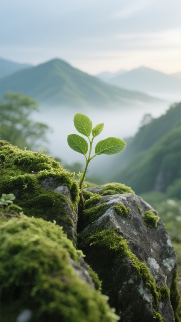 晨雾弥漫的竹林深处,一束金色的阳光如舞台追光般穿透薄雾,照亮一株斜逸而出的翠竹,竹节上凝结的露珠在光线中闪烁如碎钻,几片新抽的嫩绿竹叶低垂着触碰水面,激起一圈圈涟漪,倒影与实景在静谧的水面交织成迷离的双重世界,远处竹林层层叠叠融入朦胧的青灰色雾霭,空气中漂浮着细密的光尘,色调是清冽的翡翠绿与晨雾的柔白交织,营造出空灵而湿润的东方意境。