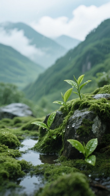 清新中式插画风,水墨渲染茶山雨景,绿意盎然,意境悠远。