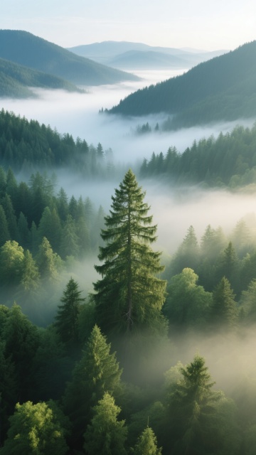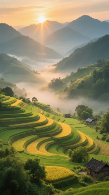 山间清晨,阳光穿透云层洒下金色光芒,茂密森林覆盖的层叠山峦在阳光照耀下呈现出丰富的绿色层次,山间薄雾尚未完全散去,在山谷间轻柔缭绕,空气清新湿润,光影对比鲜明,整体氛围明亮而宁静。