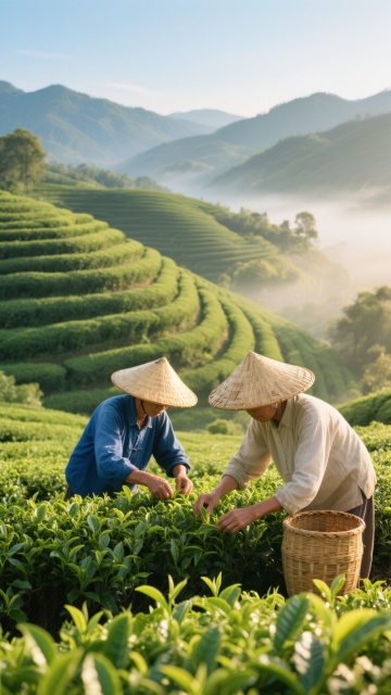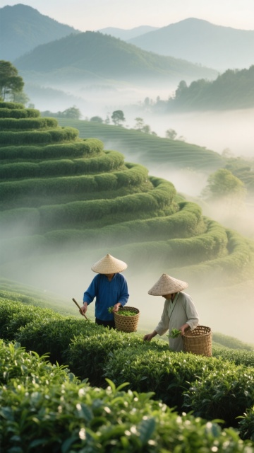 清晨薄雾笼罩的茶园梯田,层层叠叠的绿色茶树整齐排列,远景山峦若隐若现,两位戴着传统斗笠的采茶人正在田间劳作,一位身着蓝色上衣,一位穿着浅色传统服饰,手持茶篓与竹编工具,晨光柔和地洒在湿润的茶叶上,空气清新湿润,整体呈现出宁静悠远的东方田园意境,绿色调为主,光影层次丰富,写实摄影风格,细节清晰,画面富有深度和空间感。