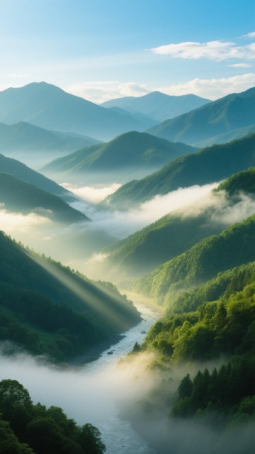 清晨或傍晚时分的山脉全景,连绵起伏的多层山峦呈现深浅不一的绿色,从近处茂密的墨绿色森林到远处被薄雾笼罩的淡绿色山峰,山间云雾缭绕如轻纱般飘荡在山谷间,一条蜿蜒的河流穿过山脚,阳光从云层间隙洒落形成柔和的光束,照亮部分山脊和河谷,天空湛蓝纯净点缀着几缕白色云朵,整体画面层次分明、色彩清新自然,营造出宁静悠远、生机勃勃的山水意境,具有高度写实的摄影质感,细节丰富的植被纹理和清晰的山体轮廓。