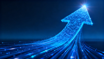 3D渲染风格,以深邃的深蓝色为主色调,搭配明亮的青色点缀,整体呈现科技感与未来感的色彩氛围。画面底部是由白色线条构成的六边形蜂窝状网格结构,网格表面带有细密的纹理,呈现出半透明的磨砂质感,网格向上延伸形成一个微微隆起的曲面。三个大小一致的白色箭头从网格表面向上发射,箭头底部喷射出由深蓝色到青色渐变的流体状烟雾,烟雾形态飘逸且富有动感,呈现出向上推进的视觉效果。背景为纯净的深蓝色渐变,从上到下颜色由浅至深,营造出广阔而神秘的空间感。整体构图采用对称式布局,三个箭头呈等距排列,形成稳定的视觉平衡,光线从上方柔和照射,使网格结构和箭头边缘产生细腻的高光,增强立体感和科技质感,画面简洁大气,传达出科技、进步与向上突破的氛围。