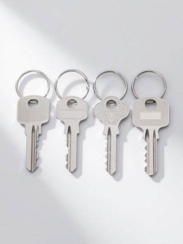超高精度摄影风格,白色纯色背景,四把不同样式的金属钥匙通过银色钥匙圈整齐排列,每把钥匙均展现出真实的不锈钢金属质感,包括清晰的拉丝纹理、边缘锐利的齿牙结构、钥匙柄上独特的雕花图案和凹槽设计,光线从左上方45度角照射,形成自然的高光反射和柔和阴影,整体构图居中对称,钥匙间保持均匀间距,呈现出干净利落的产品展示效果,细节丰富,金属光泽细腻,无任何文字或装饰元素干扰主体。
