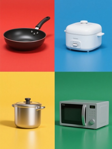 软3D风格家电产品集合海报,纯色背景,整体采用统一的渐变色彩,画面中六个规整排布的家电元素,从左到右、从上到下分别为:银色不锈钢质感的微波炉,带有黑色玻璃门和银色把手,正面有控制面板和显示屏;黑色微晶面板的电磁炉,搭配银色金属边框,中央有圆形加热区域;白色圆柱形电饭煲,顶部有黑色操作面板和圆形开盖按钮;双开门冰箱,银色金属外壳,黑色门把手,门上有透明玻璃窗;银色金属机身的咖啡机,带有黑色操作按钮和透明水箱;银色烤箱,带有双层玻璃门和银色金属把手,正面有旋钮和按键控制面板。所有家电元素保持相同的软3D光影效果,表面有细腻的金属光泽和轻微的高光反射,整体构图平衡,视觉层级清晰,信息传达高效,符合现代家电产品宣传海报的设计感。
