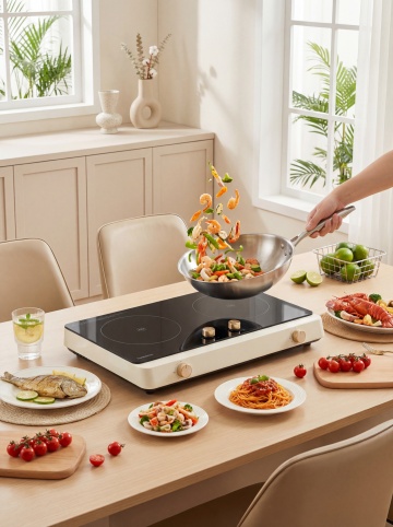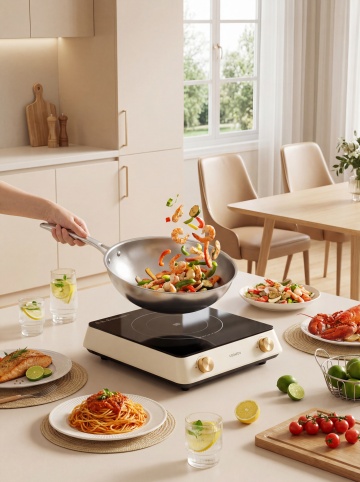 现代感与科技感交融的厨房场景,金属风电饭煲置于大理石台面,搭配清新果蔬与轻拟物设计,营造简约主义下的清爽舒适氛围。