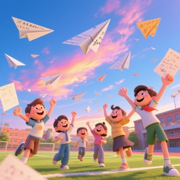 画面呈现3D卡通风格的开学场景:背着书包的男孩女孩身着英伦校服,在洒满阳光的秋日校园中欢笑前行,金黄银杏叶随风飘落,背景有可爱的卡通教学楼和湛蓝天空,整体活泼明快且不含文字,洋溢着积极盎然的氛围,尺寸调整为3:4
