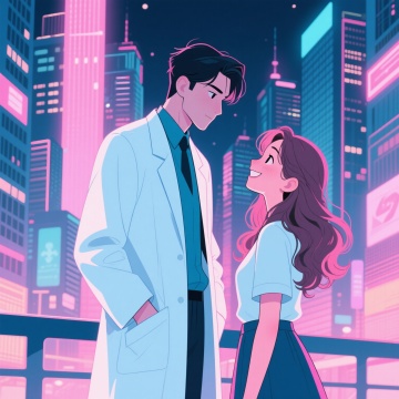 插画风情侣在湖畔相望,手捧鲜花,梦幻浪漫,清新氛围,灯光点缀,尽显温馨。
