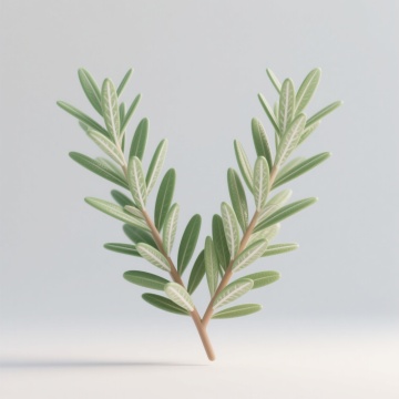 一张高分辨率的迷迭香特写照片,采用超写实风格,画面主体为两支自然弯曲的迷迭香枝条,枝条呈深绿色,带有白色条纹,枝干为淡棕色,叶片细长且边缘清晰,整体构图简洁,背景为纯白色,光线明亮柔和,从上方照射,叶片上有细微的高光和自然的阴影,展现出迷迭香叶片的质感和立体感,画面干净整洁,没有多余元素,突出迷迭香的自然形态和清新质感。