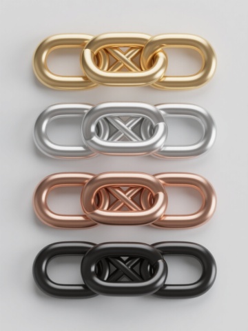 超写实3D渲染,六个不同配色、不同样式、不同材质的回形针造型,浅色背景,上下两行对齐排列,金属质感,光滑表面,精准光影,柔和阴影,极简风格,高清晰度,产品展示效果,细节丰富,立体感强,纯净背景,无其他元素干扰。