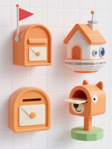 3D卡通风格邮箱系列素材集合,纯白色背景,保持圆润可爱的造型和明亮的色彩搭配,四个完全不同造型的邮箱元素规整排布:第一个是橙色传统邮箱配红色旗帜和白色信封,底座为绿色小山;第二个是蓝色圆形邮箱带黄色星星装饰和打开的信封;第三个是粉色方形邮箱配紫色蝴蝶结和飘出的信纸;第四个是绿色圆柱形邮箱带蓝色条纹和信件从投信口溢出,所有邮箱均具有光滑的塑料质感、柔和的高光和轻微的阴影,整体保持统一的卡通3D风格和欢快氛围。