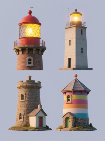 写实风格的系列灯塔素材集合,纯色背景,四个完全不同造型的灯塔元素规整排布,每个灯塔均保留灯塔主体结构特征,其中包含一座带有红色圆顶、顶部亮着黄色灯光、底部连接黄色小屋的白色圆柱形灯塔,其他三座灯塔造型各异,可能为不同塔身形状、顶部设计或附加结构,整体光影效果统一,呈现出类似原图中温暖的侧光照射质感,色彩和谐,画面简洁,无任何文字、LOGO、电话地址及二维码。