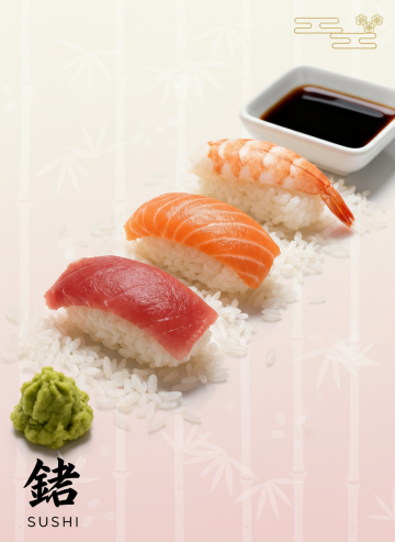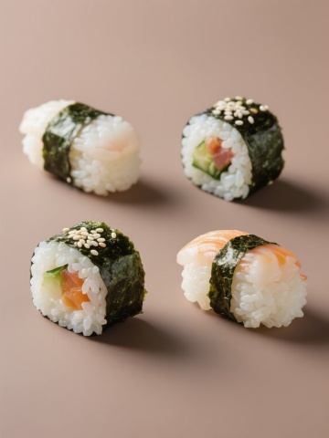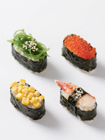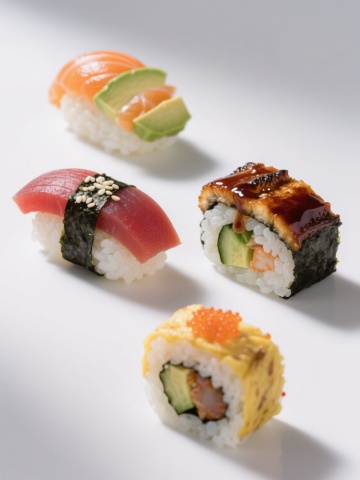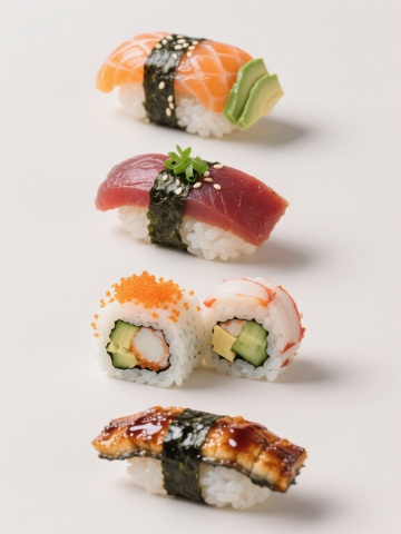 日料系列素材集合,纯色背景,规整排布四个完全不同的日料元素内容,保持高清写实风格,明亮均匀的正面光照,清晰的食材纹理细节,主色调为白色、黑色、橙色和绿色。第一个元素:精致的三文鱼刺身拼盘,三片厚切三文鱼色泽橙红鲜亮,肉质纹理清晰,表面微微反光,搭配少许白萝卜丝、紫苏叶和柠檬片;第二个元素:日式鳗鱼饭套餐,白瓷碗中盛着晶莹的米饭,上面铺着焦香四溢的蒲烧鳗鱼,淋有光泽鲜亮的酱汁,旁边点缀着腌姜片和小番茄;第三个元素:鲜虾天妇罗,金黄酥脆的天妇罗外壳,包裹着鲜嫩的整只大虾和翠绿的芦笋、南瓜片,摆放在铺有吸油纸的餐盘中,附带一小碟天汁;第四个元素:日式味增汤,深色陶碗中盛着浅棕色的味增汤,汤里有嫩豆腐块、海带结和葱花,热气腾腾,碗边放着一双木筷。所有元素均保持食物的新鲜质感和真实色泽,构图均衡,细节丰富,符合日料的精致简约风格。