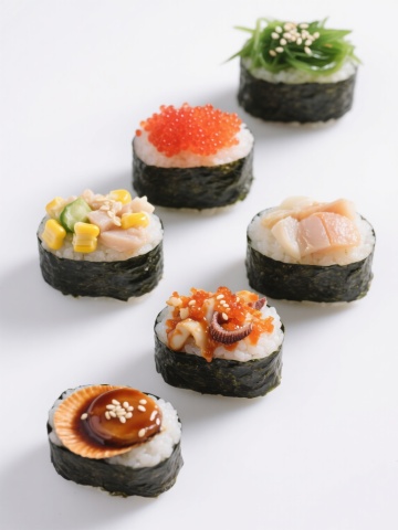 一张高质量餐饮系列素材集合海报,采用纯白色纯色背景,6个规整排布的独立食品展示区域,每个区域均为高清晰、极致写实风格的餐饮元素特写,光线明亮柔和,主光源来自左上方,呈现出自然的高光和细腻阴影,色彩鲜艳饱满且真实,食物质感细节丰富(如食材纹理、酱汁光泽、新鲜度表现)。第一个区域是一碗热气腾腾的日式叉烧拉面,白色瓷碗中装着金黄的面条、几片油亮的叉烧肉、半个溏心蛋、翠绿的葱花和深色的木耳;第二个区域是一份精致的寿司拼盘,包含三文鱼寿司、金枪鱼寿司、蟹肉寿司等,米饭颗粒分明,鱼片新鲜有光泽,摆放在黑色长方形寿司盘上;第三个区域是一只烤得焦黄酥脆的炸鸡,外皮金黄诱人,内部肉质鲜嫩多汁,旁边点缀着绿色的生菜叶,放在白色圆形餐盘中;第四个区域是一碗色彩丰富的水果沙拉,透明玻璃碗中装着草莓、蓝莓、香蕉片、猕猴桃片和生菜,上面淋着一层透明的蜂蜜或酸奶;第五个区域是一份意大利番茄肉酱面,白色宽口碗中装着红色的肉酱覆盖在螺旋形意面上,撒有绿色的罗勒叶和白色的帕玛森芝士碎;第六个区域是一块装饰精美的巧克力蛋糕,深棕色的蛋糕体层次分明,表面覆盖着光滑的巧克力酱,顶部点缀着一颗红色的草莓和少量白色奶油花纹,放在银色的蛋糕托盘上。整体设计简洁大方,信息传达直接高效,视觉层级清晰,每个食品元素都占据独立且相等的空间,无任何文字、LOGO、电话地址及二维码。