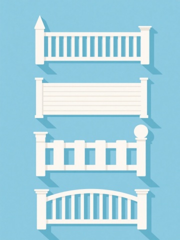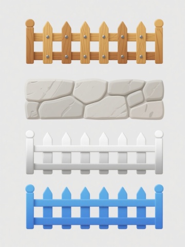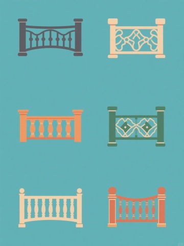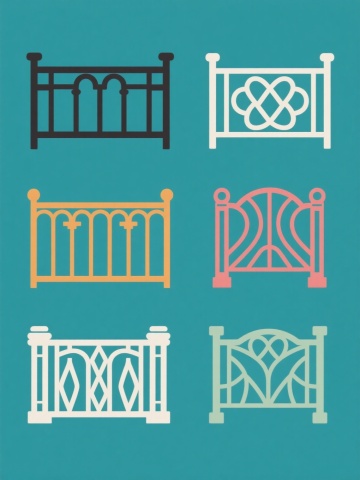 一组四个完全不同样式的栏杆系列素材集合,规整垂直排布在纯色背景上,每个栏杆均保持栏杆的核心结构特征,包括立柱、横杆和栏板基本组成部分,但造型各异:第一个为简约现代风格,采用水平细横杆与方形立柱组合,整体呈优雅的天蓝色;第二个是中式传统风格,栏板带有回字纹镂空雕花,搭配红色立柱,展现古典韵味;第三个为欧式田园风格,顶部有弧形装饰和小型柱头,整体呈温暖的米黄色;第四个是工业风风格,采用粗重的黑色方管交叉焊接形成网格状栏板,具有强烈的金属质感。所有栏杆均为正面平视角度,边缘清晰,无阴影,色彩鲜明且各自统一,适合作为设计素材使用。