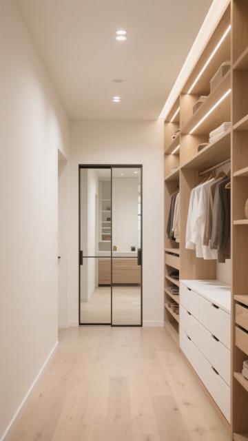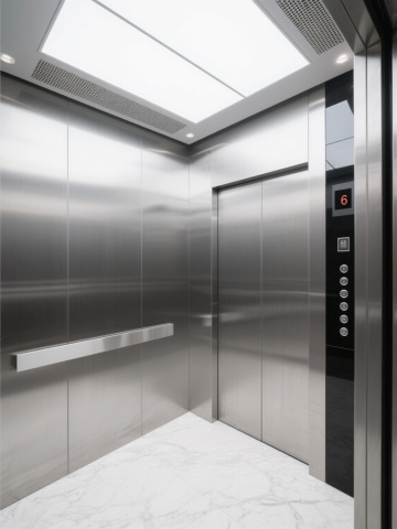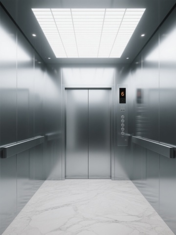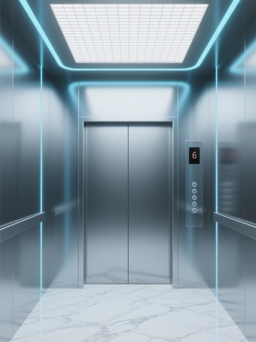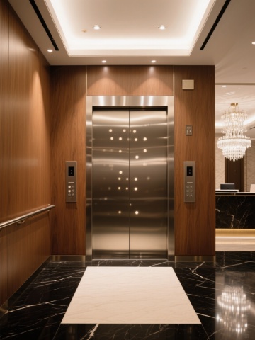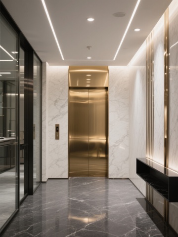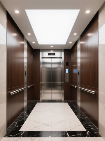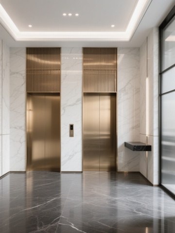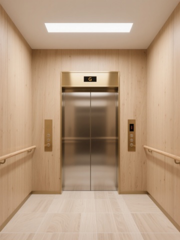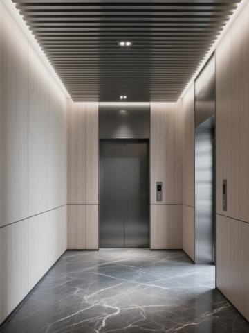 极简主义风格电梯厅设计,双开电梯门位于画面中央,两侧为浅色木质面板装饰墙,表面有细腻的木纹肌理,顶部是水平线条的灰色金属吊顶,嵌入筒灯提供柔和均匀的照明,地面铺设深色大理石瓷砖,带有自然的白色纹理,整体色调以浅木色、灰色和深石色为主,营造出简约、高级、宁静的氛围,光线柔和,阴影过渡自然,材质质感清晰可见,空间布局对称且具有现代设计感。