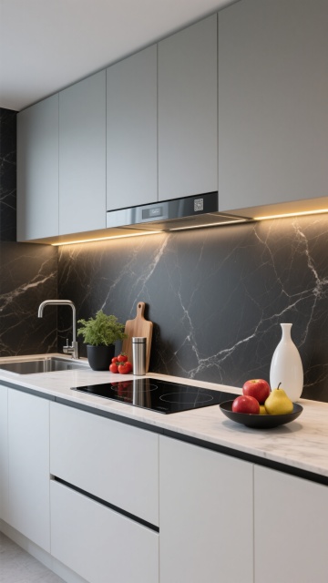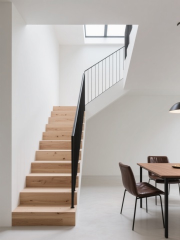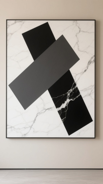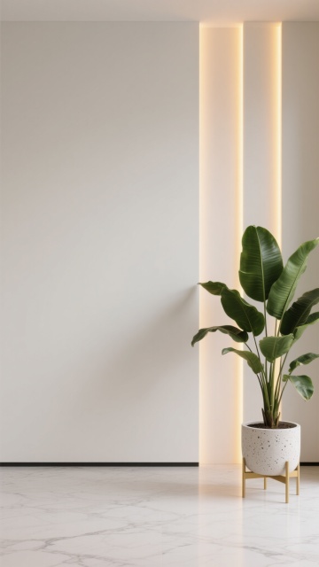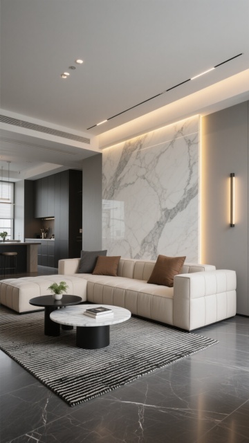 俯瞰视角,极简主义风格客厅以深邃的墨黑与温润的原木色为基调,倾斜45度的构图展现出几何切割般的空间层次感。清晨的冷蓝色光线从整面无框玻璃墙斜射而入,在深灰色微水泥地面上投下窗格的几何阴影,窗外是被薄雾笼罩的城市天际线剪影。中央悬浮着一个由黑色金属框架与烟熏玻璃台面构成的不规则多边形茶几,周围环绕着三张浅灰色模块式布艺单人沙发,每个沙发配有一个芥末黄皮质靠垫。右侧墙面是整面的胡桃木饰面板,内嵌线性LED灯带勾勒出隐藏式储物空间的轮廓。天花板采用悬浮式设计,中央垂挂着一个由12个不规则玻璃球体组成的艺术吊灯,在地面投射出破碎的光斑图案。空间角落摆放着一株大型琴叶榕,其深绿色叶片与整体冷色调形成鲜明对比。地面铺设着一块巨大的米白色羊毛手工编织地毯,边缘处有渐变的黑色几何图案。整体氛围呈现出一种冷静的奢华感,光线在不同材质间的反射创造出丰富的视觉层次,既保留了原空间的通透感,又通过色彩与光影的转变赋予其北欧极简的清冷美学。