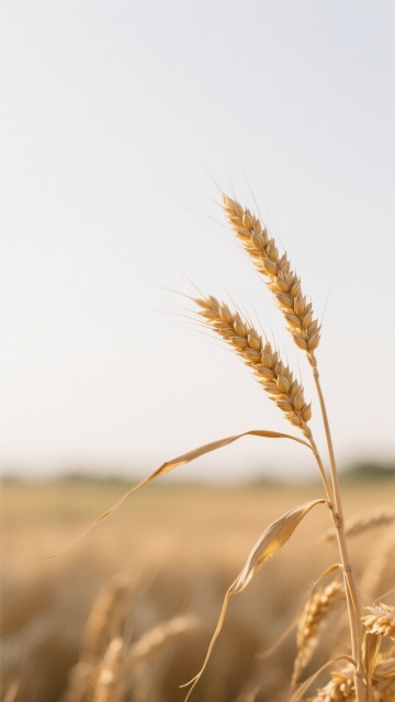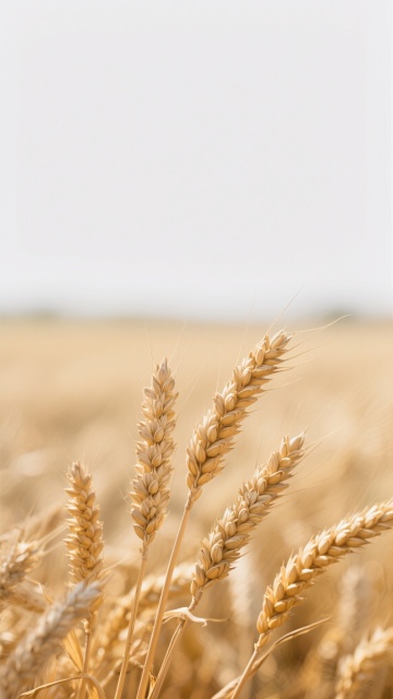 温暖明亮的插画风格,以金黄色和橙黄色为主色调的麦田场景,柔和的阳光从云层间洒落,光线均匀,阴影浅淡,近处是随风轻轻摇曳的麦穗,穗尖带有白色高光,质感柔软蓬松,中景是起伏的金黄色麦浪,线条流畅自然,远景有几棵造型简约的深绿色树木点缀,天边是淡蓝色的天空,漂浮着几朵蓬松的白云,一群飞鸟呈V字形掠过天际,画面中央偏右位置有一座带有黑色烟囱的白色小房子和旁边的谷仓,整体构图采用三分法,视觉焦点集中在麦田与小屋的和谐景象上,营造出宁静、丰收、惬意的田园氛围,设计感简洁明快,色彩过渡柔和,充满温馨的秋日气息。