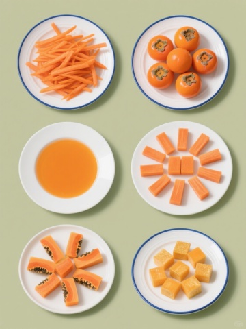 一套6张的系列素材集合,每张均为简约现代风格,纯色背景,无任何文字、logo及水印。第一张:白色圆形瓷盘,边缘有蓝色细圈装饰,盘中规整排布着大量橙色胡萝卜丝,胡萝卜丝呈细长条状,色泽鲜亮,整体造型简约现代。第二张:白色圆形瓷盘配蓝色细圈边缘,盘中整齐摆放着完整的橙色橙子,橙子表皮光滑,果蒂清晰,保持与第一张一致的简约现代风格和纯色背景。第三张:白色圆形瓷盘带蓝色细圈边缘,盘中盛放着橙色橙汁,橙汁表面平静,色泽均匀,延续系列的简约现代感与纯色背景。第四张:白色圆形瓷盘边缘蓝色细圈,盘中规整排布橙色柿子,柿子呈扁圆形,果皮光滑,保持整体简约现代风格及纯色背景。第五张:白色圆形瓷盘配蓝色细圈边缘,盘中整齐摆放橙色木瓜块,木瓜块呈长方体,果肉色泽鲜亮,延续系列简约现代风格与纯色背景。第六张:白色圆形瓷盘带蓝色细圈边缘,盘中规整排布橙色金瓜块,金瓜块呈块状,保持整体简约现代风格及纯色背景。所有素材均保持统一的简约现代风格、纯色背景、白色瓷盘配蓝色细圈边缘的设计元素,仅替换盘中的橙色系元素(胡萝卜丝、橙子、橙汁、柿子、木瓜块、金瓜块)。