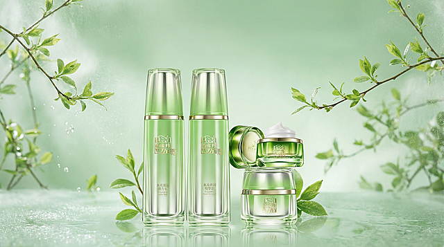 一瓶精华的特写,玻璃台子,背后是一片动态模糊有残影的竹子,淡绿色渐变背景详情