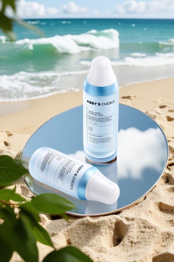 现代简约设计,清透瓶身展现清爽感,轻拟物风与性冷淡色调融合,海边背景增添自然气息。