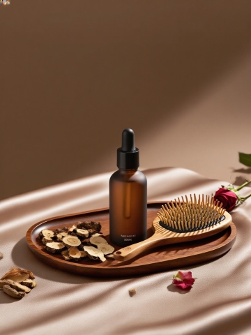 保持主体外观和形状。主体放置一根木块上,搭配人参、干枯树枝、何首乌、当归、侧柏叶。以暖棕色调远山为背景,营造古朴自然且高级的质感。