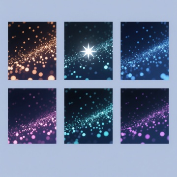 一组由6个独立画面组成的系列星空素材集合,每个画面均采用纯色背景,保持3D渲染的星点粒子效果风格,画面整体色彩各不相同,元素内容为大小不一、疏密有致的发光星点,其中包含一个较亮的中心星光,所有画面规整排布,每个画面中的星点分布和亮度层次保持一致,仅背景颜色和星点发光颜色发生变化,营造出统一而富有变化的星空系列感。