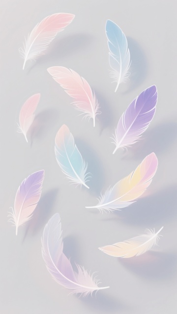 多根轻盈飘逸的羽毛,以散落悬浮的姿态分布在纯净的白色背景上,羽毛边缘带有细腻柔和的白色描边,整体呈现出简约、空灵、唯美的插画风格,光影处理柔和,强调羽毛的轻盈质感与透明感,色彩变换为淡粉色、淡蓝色、淡紫色、淡黄色等柔和的马卡龙色系,保持羽毛原有的形态和飘逸感,营造出梦幻、浪漫的氛围。