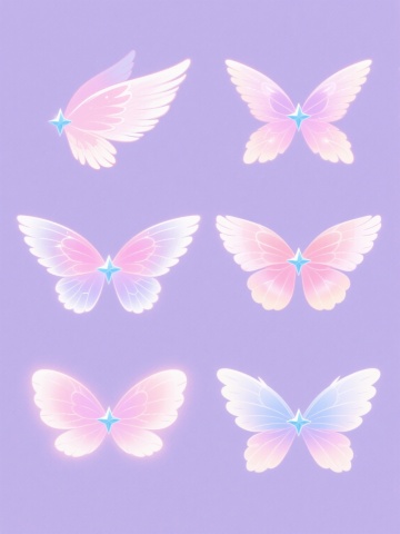 一组6个不同配色、不同样式、不同材质的翅膀造型,包含实物翅膀与手绘风,采用纯色背景,上下两行对齐排列。整体呈现柔和的渐变色彩,主要为粉紫色调,带有轻盈通透的质感,翅膀边缘有细腻的白色羽毛纹理,中心点缀着闪亮的蓝色星星装饰,风格统一为梦幻、可爱的插画风格,光影柔和,色彩过渡自然,具有一定的立体感和层次感。