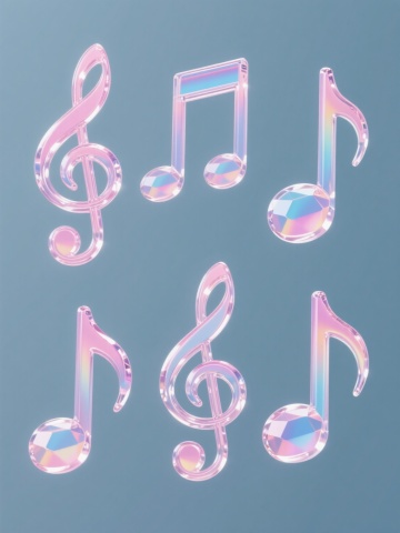 白色背景上,六个造型完全不同的音乐符号系列素材集合规整排布,每个素材均保持原有的飘逸线条、渐变色彩过渡和轻盈灵动的设计风格,但整体色彩各不相同,包含高音谱号、低音谱号、八分音符、十六分音符、升号等核心音乐元素,元素之间通过流畅曲线自然连接,整体呈现出和谐统一的视觉美感与音乐韵律感,适合作为音乐主题的装饰或设计素材。