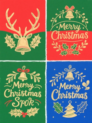 四个圣诞节主题装饰图案的系列集合,每个图案均采用复古手绘风格,带有粗糙纹理的红色和绿色配色,元素包括圣诞帽、圣诞树、雪花和礼物盒,每个元素下方配有相应的英文单词“Santa Hat”、“Christmas Tree”、“Snowflake”、“Gift Box”,文字采用装饰性衬线字体,整体设计简洁明快,适合节日装饰使用,白色纯色背景,四个图案呈2x2网格规整排布。