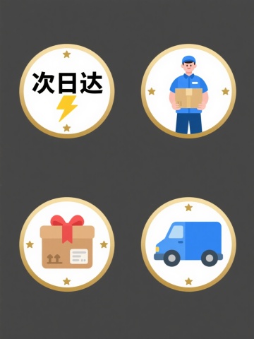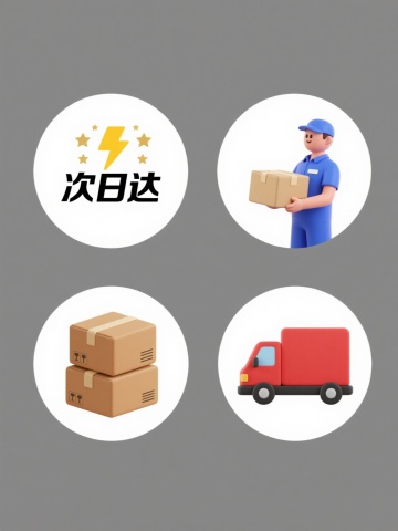 极简风格图标集合,纯色背景,4个等大正方形图标规整排布,保持简约扁平设计语言,粗线条勾勒轮廓,无渐变无阴影。第一个图标:蓝色快递货车,车厢方正,车轮圆形,车尾带速度线条;第二个图标:橙色快递员,站立姿态,身着制服,手持包裹;第三个图标:绿色包裹箱,立方体造型,贴有快递单标签;第四个图标:紫色快递站建筑,包含屋顶、门和窗户元素,线条简洁明快。