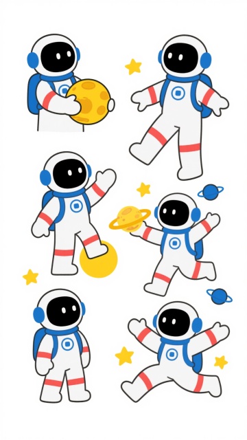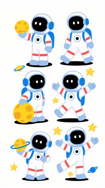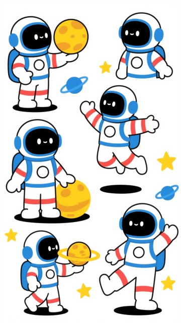 白色背景,3D渲染风格,六个不同动态和场景的卡通宇航员系列素材集合规整排布,每个宇航员保持白色宇航服搭配金色细节的设计,头盔为深色反光面罩,包含背包和管线元素,分别展示漂浮、挥手、敬礼、探索、休息、操作设备的姿态,整体光影统一为柔和高光与轻微阴影,构图均衡对称,所有元素风格统一且细节丰富,适合系列化展示