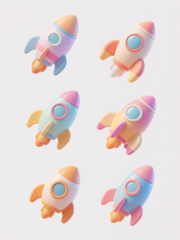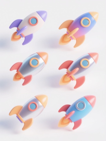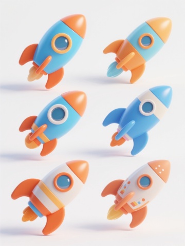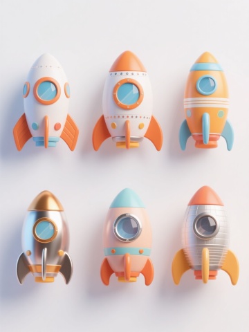 6个不同样式、不同材质、不同风格的3D卡通风格火箭,整体呈现圆润可爱的造型,色彩明快柔和,每个火箭拥有独特的配色方案(如有的以蓝色为主色调搭配黄色推进器,有的采用粉色渐变结合金属质感细节),材质包括光滑的塑料质感、带有光泽的金属部件、磨砂哑光表面等,风格涵盖复古太空、未来科技、可爱动物造型、几何抽象、手绘卡通、科幻机械等,所有火箭在纯白色背景上以整齐的行列方式排列,保持统一的光照效果(柔和的顶部光源,轻微的阴影增强立体感),每个火箭细节丰富,如不同形状的窗口、各异的尾翼设计、独特的推进器火焰样式,整体画面简洁明快,充满童趣与想象力,具有清晰的视觉层次和高效的信息传达效率。