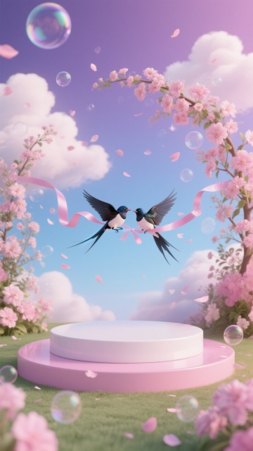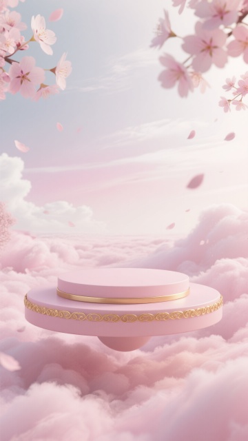 画面中心是一个粉色展台,展台为圆形,底部是粉色的,顶部是浅蓝色的。展台周围是绿色的草地,草地上开满了粉色的花朵。背景是粉色的天空,天空中有许多粉色的云朵,远处是绿色的山丘,山丘上也开满了粉色的花朵,山丘之间有一条小河。整个画面充满了春天的气息,色彩柔和,给人一种温馨、浪漫的感觉。