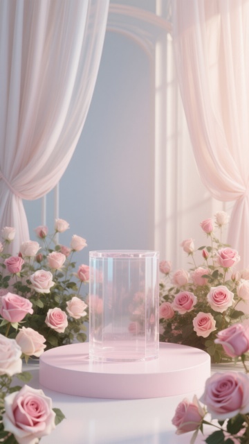 整体温馨、甜蜜,背景是的色飘逸的窗帘,前景是透明的粉白展台,展台周围环绕着盛开的玫瑰花朵