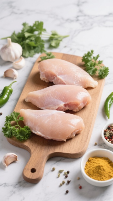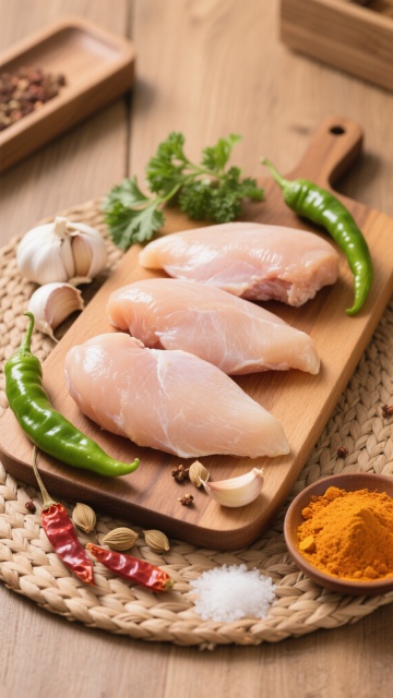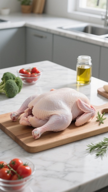 厨房场景,一只手正拿着厨房剪刀剪开一只烤得焦香冒油的烤鸡,鸡皮呈现油亮的金黄色,烤鸡被剪开成几块放在木头砧板上。背景中可见厨房环境和烤箱,砧板上散落着几粒小西红柿和切开的西红柿,右侧有一个透明碗,碗中露出两片新鲜的生菜叶子,整体画面充满生活气息和食物的诱人质感