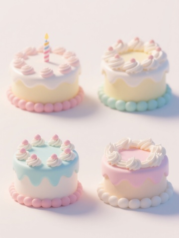 一套四个不同元素的系列素材集合,每个元素均采用圆润可爱的3D立体卡通风格,拥有光滑的表面质感和柔和的渐变色彩,高光部分明亮突出,底部带有淡淡的阴影效果,整体呈现出温馨甜美的氛围,元素被规整地排布在纯色背景上;第一个元素是一个蓝白渐变的双层生日蛋糕,顶部插着一根红白条纹的点燃蜡烛,旁边有一个黄色星星形状的饼干,蛋糕表面覆盖着白色奶油,边缘有波浪形花纹;第二个元素是一个粉紫渐变的三层冰淇淋甜筒,最上面是一个粉色的樱桃,甜筒表面有白色的糖粒,每一层冰淇淋的颜色由下至上逐渐变浅,底部是棕色的脆筒;第三个元素是一个黄绿渐变的圆形饼干礼盒,礼盒上系着一个粉色的蝴蝶结,礼盒表面有白色的波点图案,礼盒的盖子微微打开,露出里面的几块不同形状的饼干;第四个元素是一个橙红渐变的圆形甜甜圈,甜甜圈表面覆盖着橙色的糖霜,上面撒着白色的糖屑,中间的孔洞周围有一圈白色的奶油花边,顶部放着一颗红色的草莓。