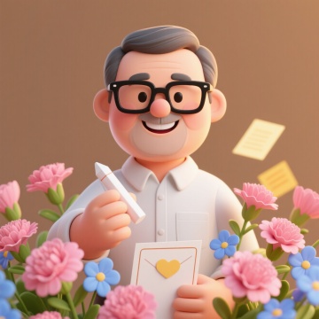 温馨软3D风,卡通老师手持贺卡,花丛环绕,节日祝福氛围浓厚。