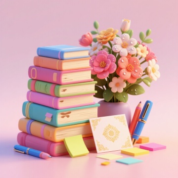 软3D风卡通人物,手捧书本,置身花丛,清新自然,充满童趣与温馨。