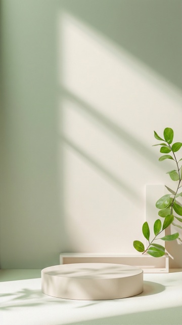 极简主义3D渲染,简约现代风格,柔和自然光从右上角斜射,在浅米色磨砂质感背景墙上投下清晰的植物叶片阴影,画面左侧有一株翠绿的绿植枝叶自然垂落,白色弧形展示台上放置一个绿色圆形物体,整体色调以米白、浅灰、不同层次的绿色为主,光影柔和细腻,阴影过渡自然,营造出宁静、清新、简约的氛围,留白充足,构图采用不对称平衡,具有高度的空间感和立体感。