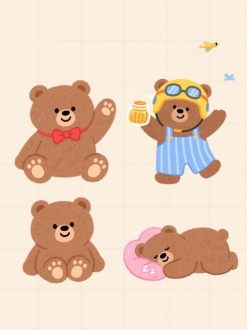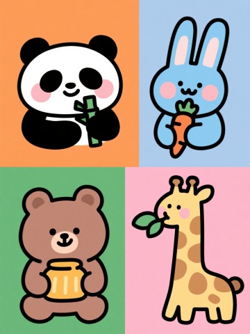 一套四个规整排布的可爱卡通动物插画,保持圆润简约的手绘风格,粗黑色轮廓线,柔和渐变填充色,每个动物都有腮红和拟人化表情,背景为纯色且各不相同,分别是:1. 橙色背景上吃竹子的熊猫,2. 蓝色背景上啃胡萝卜的兔子,3. 绿色背景上抱蜂蜜罐的小熊,4. 粉色背景上吃树叶的长颈鹿,所有元素保持相同大小和统一的卡通风格。