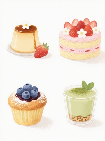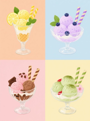 一系列4个水彩风格插画,每个插画中都有一个不同的可爱小动物(第一幅是兔子,第二幅是小熊,第三幅是小猫,第四幅是小狗),它们都趴在一个装满不同甜点和水果的玻璃甜品杯上,每个小动物都有腮红和微笑的表情,背景为纯色(每个插画背景颜色不同,分别为浅粉色、浅蓝色、浅绿色、浅黄色),整体色彩柔和,线条细腻,画面温馨可爱,4个插画规整地排列在一起形成一个集合。