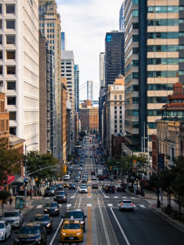 城市夜景,黄昏向夜晚过渡的深蓝色渐变天空,高楼大厦林立,玻璃幕墙反射着落日余晖与城市灯光,建筑群呈现出金属与玻璃的现代质感,街道上有流动的车灯轨迹,整体氛围宁静而繁华,远处天空有淡淡的云彩,光影对比鲜明,突出建筑的立体感和城市的纵深感。
