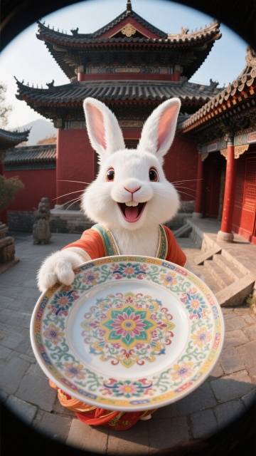俯瞰全景摄影,一只拟人化的嫦娥白兔,脸怼镜头大笑,右手拿着巨大的中式花纹的盘子向前伸到镜头前面(居中特写盘子),周围是中式古建筑,球形超广角,暖色调