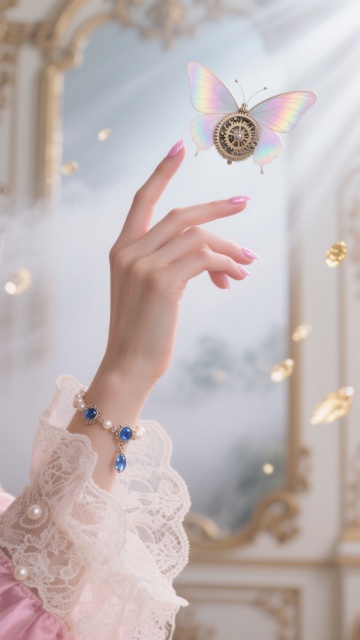 特写镜头,一位身着18世纪洛可可风格蕾丝袖口的贵族女性,其修长手指涂着淡粉色珍珠光泽指甲油,正以食指向上伸直、其余手指自然弯曲的优雅姿态,轻触一只悬浮在晨雾中的机械蝴蝶翅膀,蝴蝶的齿轮与薄纱翅膀在光束中折射出彩虹光晕,手腕处垂落的蓝宝石手链随动作微微晃动,手部皮肤细腻白皙并泛着珍珠母贝般的自然光泽,关节处有精致凹陷,手掌内侧和手指根部的阴影在柔光下形成立体层次,背景是朦胧的凡尔赛宫镜厅局部与漂浮的金色光点,色调以象牙白为基底,点缀着淡粉与宝石蓝的优雅碰撞。