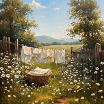水彩风插画,清新舒适,少女溪边洗衣,衣物随风轻扬,自然田园风光。
